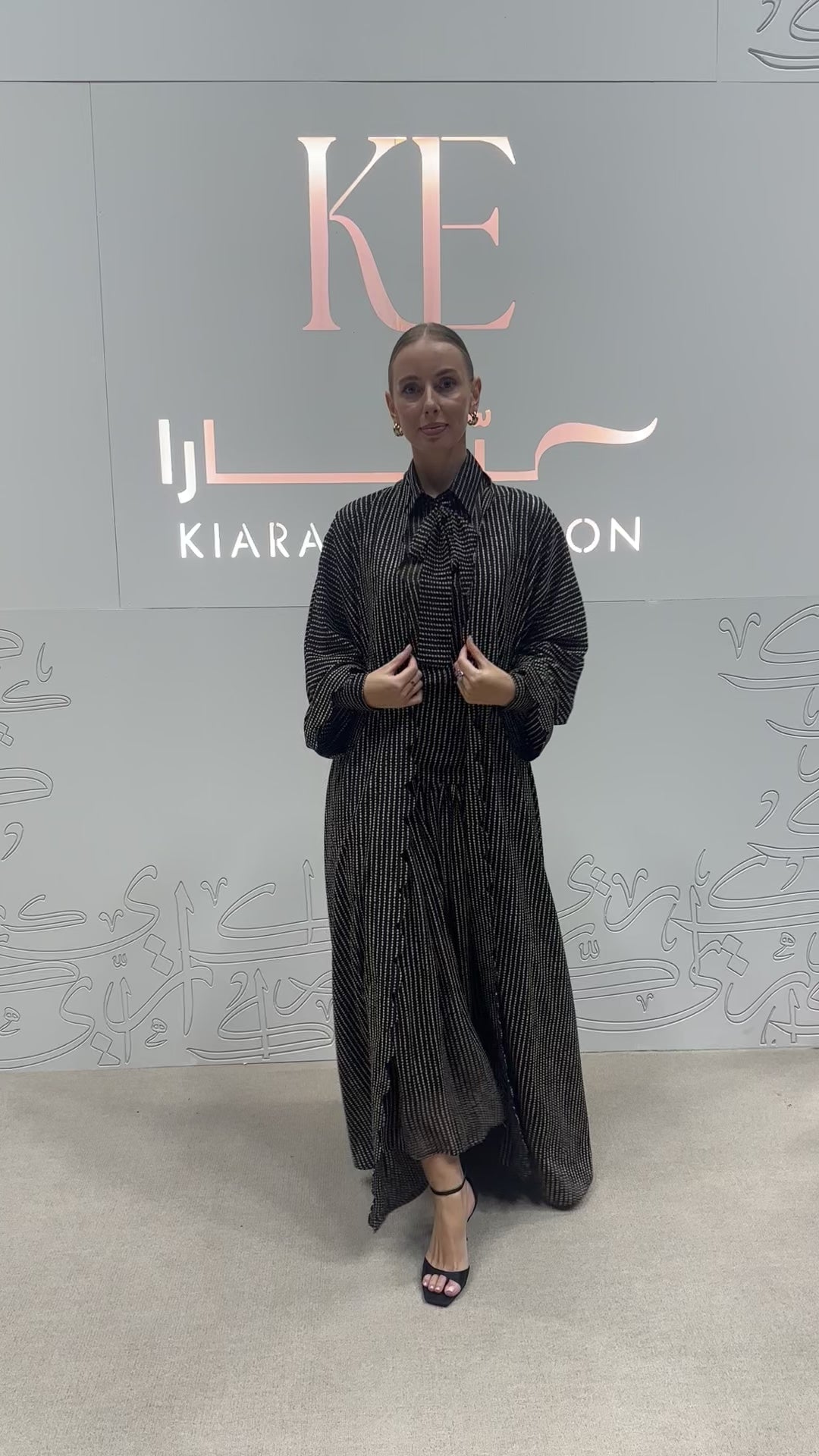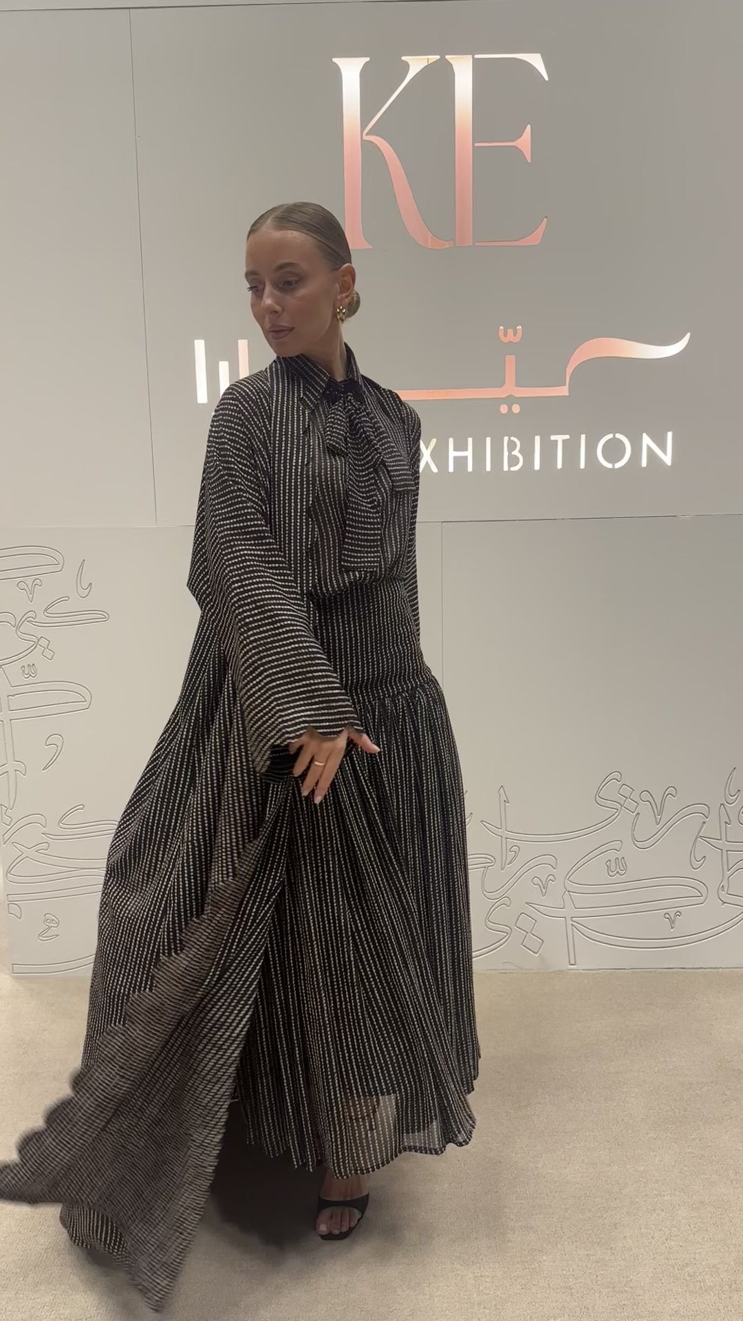 A stunning 3 pieces set comes with a shirt and detachable front bow tie, a flowy skirt with 6 meters of fabric gathered around the hip, and matching turban. This set pairs perfectly with our Polka Dot Abaya.